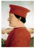 Duke Frederico has fascinated me since I first saw his portrait–one of Piero della Francesca’s most famous. A close headshot, you may have seen it hung facing the one of his wife–in the Uffizi, in an art book, or on a poster. (Not in a Tuscan Villa, page 249)