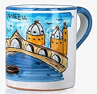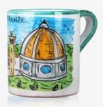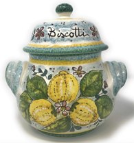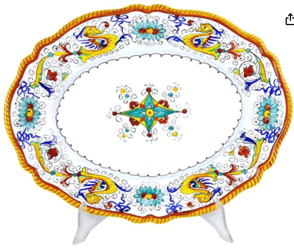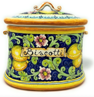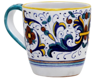 Not far from Perugia is the town of Deruta, famous for centuries for its painted pottery. For years I’ve coveted their bowls, jars, place settings, and platters–with their hand-painted, brilliant-colored designs. Like pasta, pottery designs vary from city to city, many dating back before the Renaissance. The most classic design, with flowers, curlicues, and bearded griffons in gold, blue, and green, is from Florence. When we arrive in Deruta, the variety of designs and shapes in the stores is mind-numbing. We pass up the megastores along the entry road and drive to the hilltop to walk among the artisan shops. John follows patiently from store to store as I rhapsodize over the workmanship and different patterns. (Not in a Tuscan Villa, page 170)