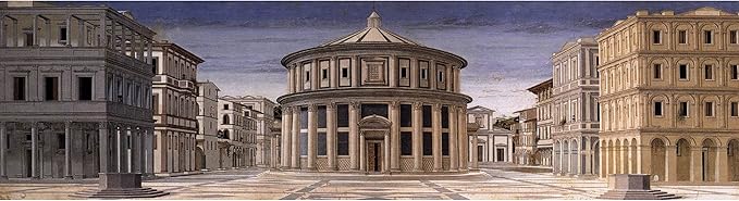In another part of the palace, we study Piero della Francesco’s painting entitled An Ideal City. It portrays a wide piazza. In the center is a round, columned structure flanked on both sides by a street of porticoed buildings. Devoid of any life except for two tiny birds, it depicts perfect symmetry painted in perspective. (Not in a Tuscan Villa, page 250)